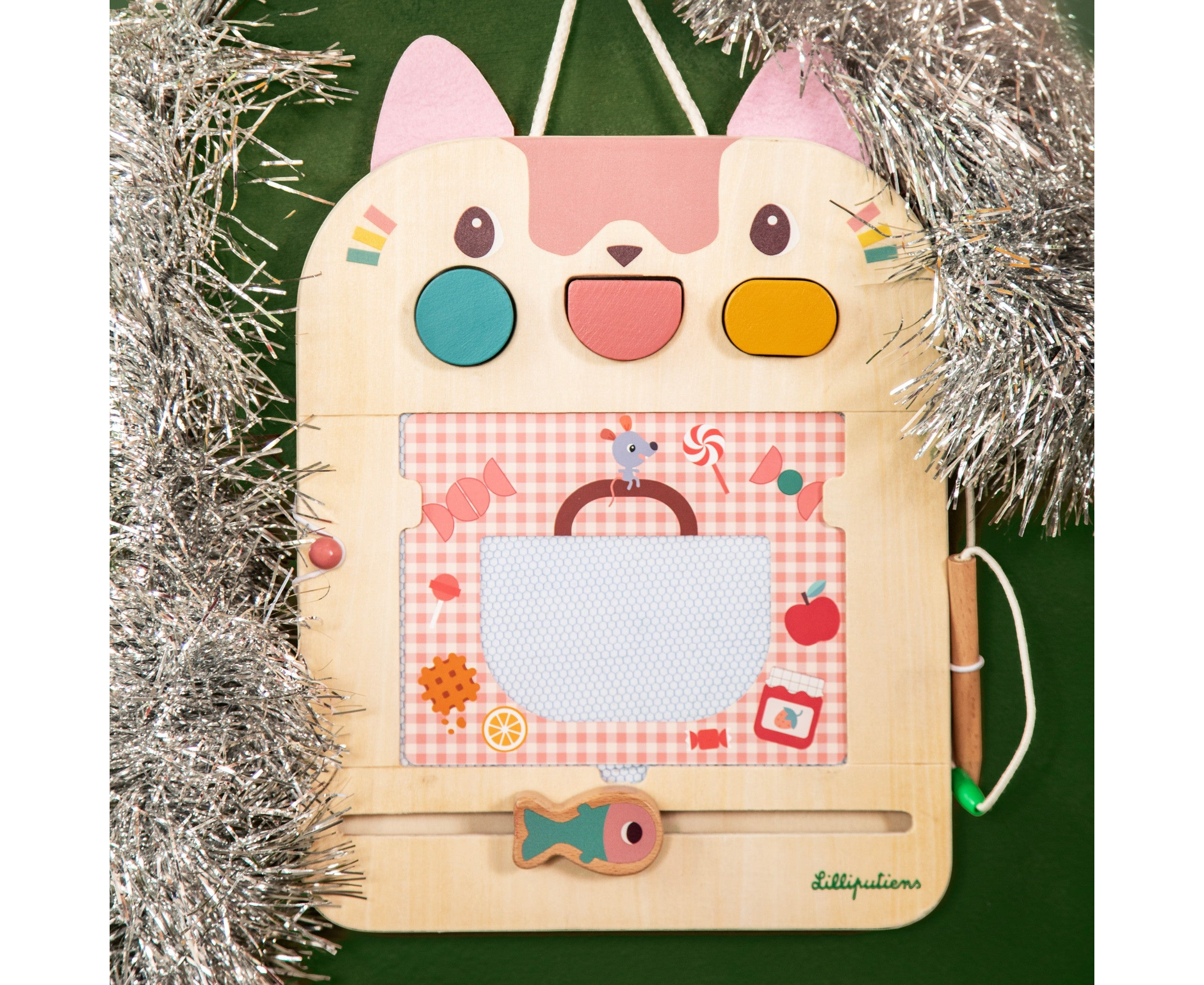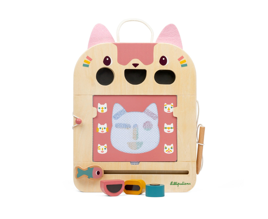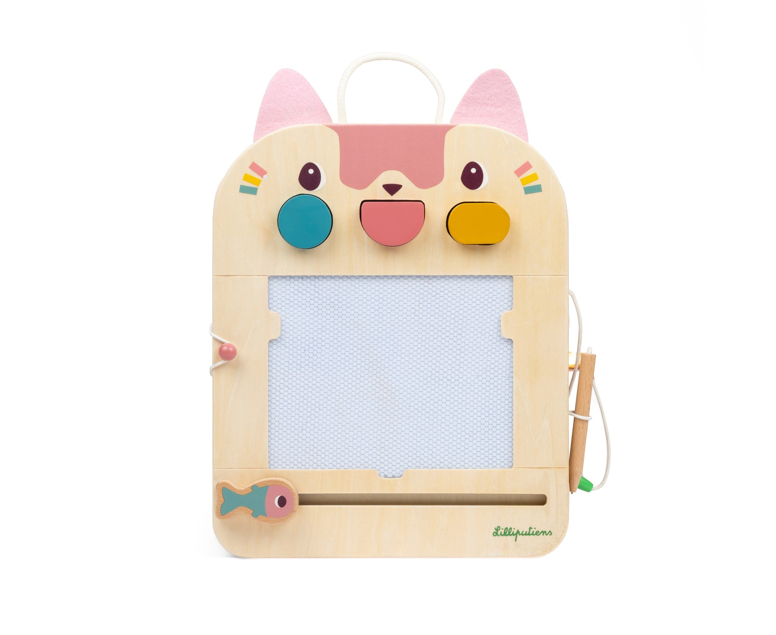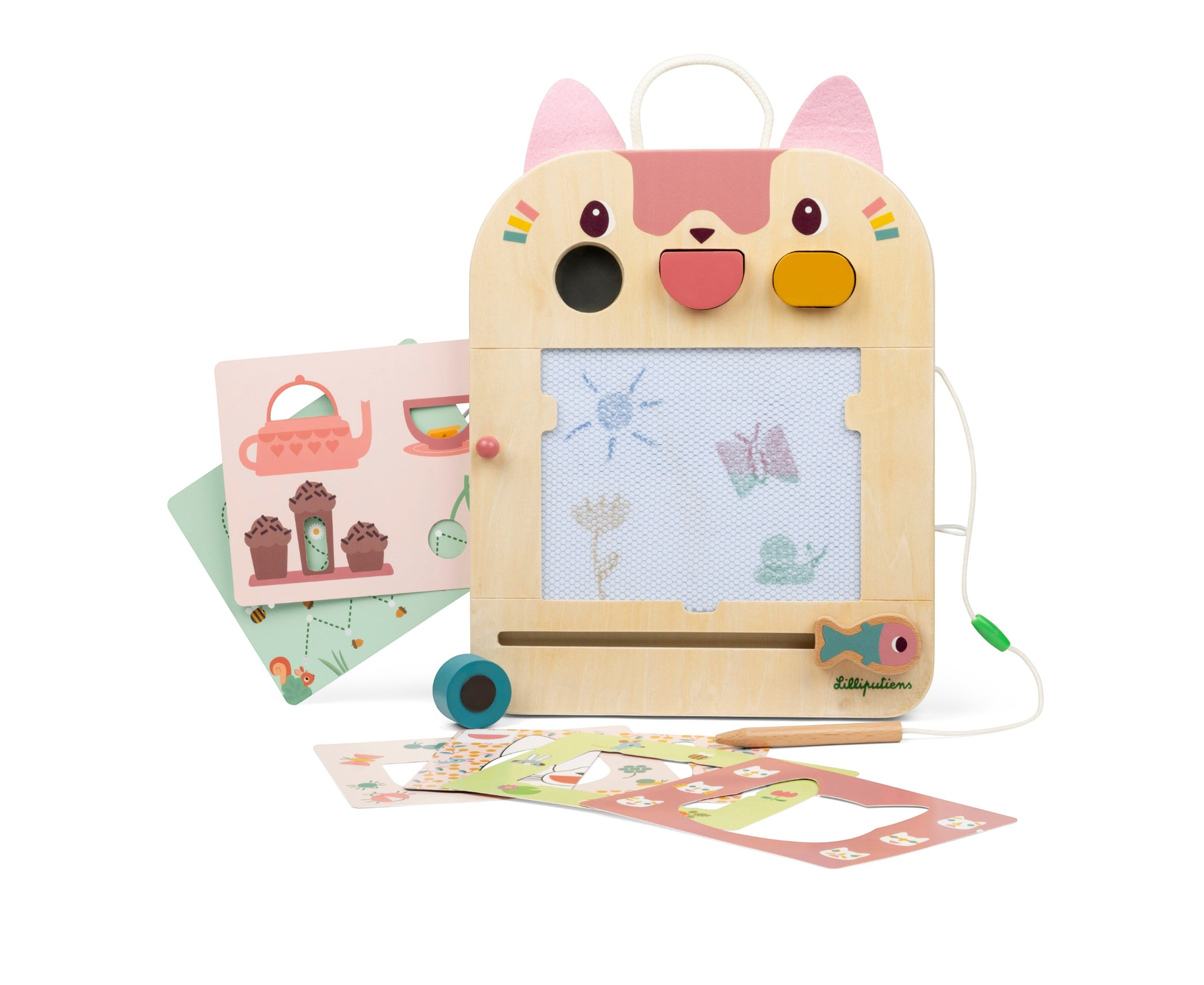Έκανες κάποιο λάθος ή θέλεις να δημιουργήσεις ένα νέο σχέδιο; Τότε με το χαριτωμένο ψαράκι μπορείς να σβήσεις ότι έχεις κάνει και να ξεκινήσεις από την αρχή. Οι κάρτες παιχνιδιών αποθηκεύονται στην ειδική υποδοχή στο πίσω μέρος και το ξύλινο μολύβι είναι στερεωμένο με σπάγκο για να μη χαθεί.