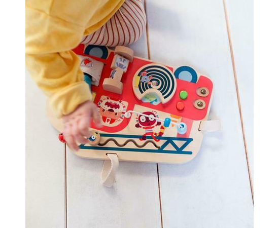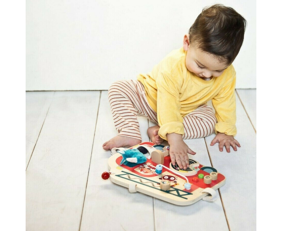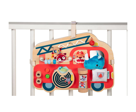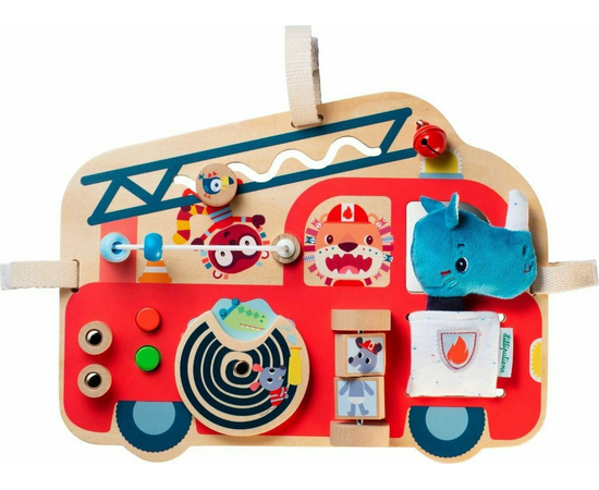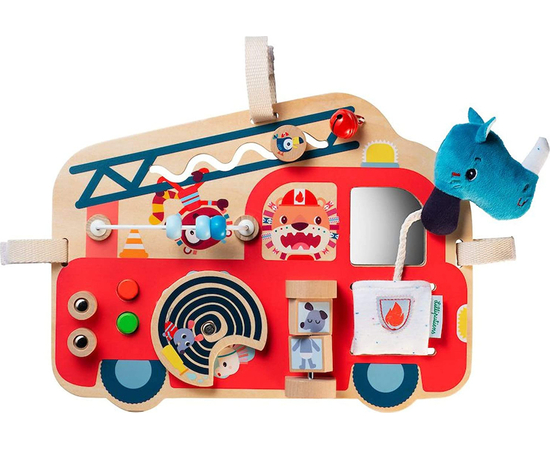 Ξύλινος πίνακας δραστηριοτήτων από τη Lilliputiens, που απεικονίζει ένα πυροσβεστικό όχημα. Προσφέρει αμέτρητες δραστηριότητες και προσαρμόζεται εύκολα στο πάρκο χάρη στις ταινίες velcro.