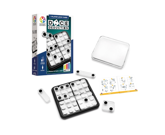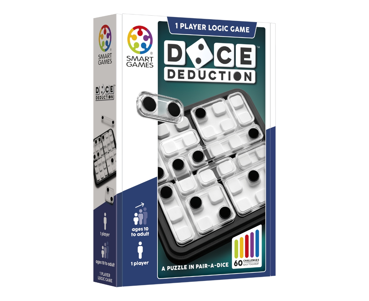 Η εταιρεία SmartGames παρουσιάζει το Dice Deduction, ένα παιχνίδι στρατηγικής σκέψης και αριθμητικής λογικής που θα σας βάλει για τα καλά σε… κατάσταση ζαριάς! Στόχος του παιχνιδιού είναι να τοποθετήσετε τα διάφανα κομμάτια στο ταμπλό έτσι ώστε οι μαύρες κουκίδες να ευθυγραμμίζονται με τις πλευρές των ζαριών που εμφανίζονται στην εκάστοτε πρόκληση — και τα αθροίσματα να ταιριάζουν με τα βέλη! Με 60 προκλήσεις κλιμακούμενης δυσκολίας, το παιχνίδι συνδυάζει μαθηματική σκέψη και στρατηγικό σχεδιασμό, αναπτύσσοντας δεξιότητες όπως λογική, αντίληψη χώρου, προγραμματισμό κινήσεων και συγκέντρωση. Κάθε πρόκληση έχει μία μοναδική λύση, που μπορείτε να ανακαλύψετε στο τέλος τους εγχειριδίου που περιλαμβάνεται στη συσκευασία. Περιεχόμενα: Ταμπλό παιχνιδιού με 4 πλευρές ζαριών, 12 διάφανα κομμάτια (8 με μαύρες κουκίδες και 4 κενά), βιβλιαράκι με 60 προκλήσεις και λύσεις. Ένα έξυπνο, αριθμητικό παιχνίδι για έναν παίκτη από 10 ετών και άνω — εκεί όπου η τύχη συναντά τη λογική