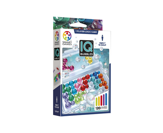 Ένα φανταστικό επιτραπέζιο ταξιδίου από την εταιρεία SmartGames, που ενισχύει τη συγκέντρωση, τον λογικό τρόπο σκέψης και την επίλυση προβλημάτων. Το παιχνίδι IQ Bubbles είναι ιδανικό για μικρούς και μεγάλους από 7 ετών άνω και αποτελεί μια εξαιρετική πρόκληση για το μυαλό! Σκοπός του παιχνιδιού είναι να τοποθετηθούν όλα τα πιόνια στο ταμπλό, ακολουθώντας τις οδηγίες της πρόκλησης που έχει επιλεγεί. Κάθε πρόκληση έχει μόνο μία σωστή λύση, κάνοντάς το ιδιαίτερα εθιστικό και ενδιαφέρον. Το παιχνίδι περιλαμβάνει 120 προκλήσεις κλιμακούμενης δυσκολίας και προσφέρει ατελείωτες ώρες διασκέδασης και εξάσκησης του μυαλού. Έχει πρακτική συσκευασία, ιδανική για ταξίδια. Ενισχύει τη συγκέντρωση, την επίλυση προβλημάτων και την χωρική αντίληψη. Η συσκευασία περιλαμβάνει ένα ταμπλό παιχνιδιού, 11 πιόνια και ένα βιβλιαράκι με τις 120 προκλήσεις και τις λύσεις τους.