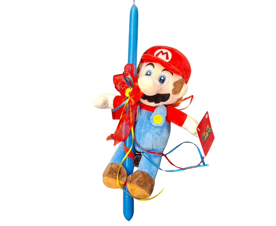 Χειροποίητη πασχαλινή λαμπάδα με τον Super Mario.Το κερί είναι στολισμένο με κορδέλες και διάφορα διακοσμητικά, το λούτρινο είναι σταθερά τοποθετημένο πάνω στο κερί. Η λαμπάδα είναι τοποθετημένη σε κουτί προβολής της σύνθεσης. Πρόκειται για ένα μαλακό και ελαφρύ λούτρινο που φωλιάζει ευχάριστα στην αγκαλιά!