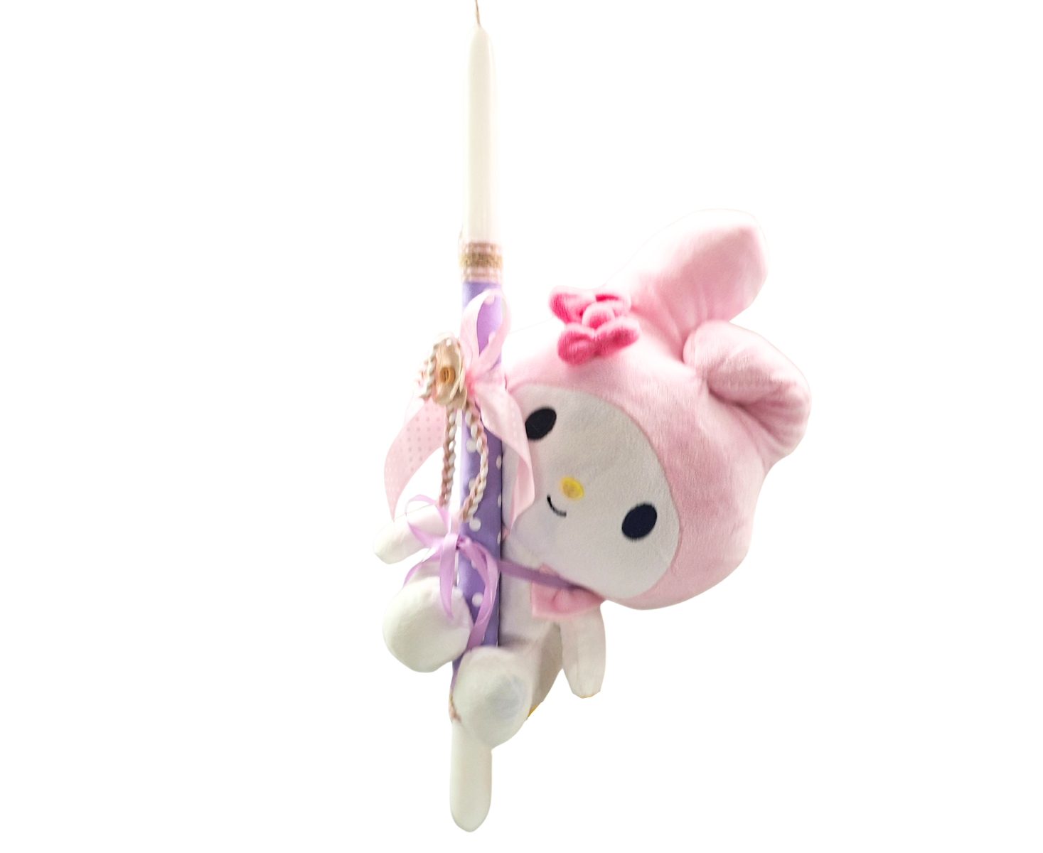 Χειροποίητη πασχαλινή λαμπάδα με την Melody της σειράς Hello Kitty.Το κερί είναι στολισμένο με κορδέλες και διάφορα διακοσμητικά, το λούτρινο είναι σταθερά τοποθετημένο πάνω στο κερί. Η λαμπάδα είναι τοποθετημένη σε κουτί προβολής της σύνθεσης. Πρόκειται για ένα μαλακό και ελαφρύ λούτρινο που φωλιάζει ευχάριστα στην αγκαλιά!