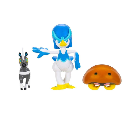 Περιλαμβάνει τρεις φιγούρες Pokémon, σχεδιασμένες για διαδραστικό παιχνίδι μάχης και παρουσίαση.