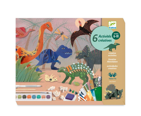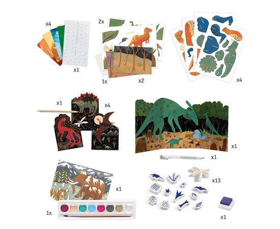 Καλωσορίσατε στην εποχή των δεινοσαύρων! Αξιοποιήστε τον ελεύθερο χρόνο των παιδιών δημιουργικά με τα σετ εικαστικών της εταιρείας Djeco και ζωντανέψτε θαυμαστούς κόσμους δημιουργώντας ανάγλυφα τοπία και τρισδιάστατους δεινόσαυρους! Στο σετ 'Ο κόσμος των δεινοσαύρων' το παιδί θα απασχοληθεί με 6 διαφορετικές δραστηριότητες που περιλαμβάνουν ζωγραφική με νερομπογιές, σφραγίδες, χαρακτική εικόνας, χρωματισμό με φύλλα χρυσού αυτοκόλλητων λεπτομερειών, 3D παζλ και κολλάζ. Ένας φανταστικός τρόπος πειραματισμού με διαφορετικά είδη τέχνης και χειροτεχνίας που βελτιώνει τις δεξιότητες της κίνησης, τη συγκέντρωση, αναπτύσσει τη λεκτική και τη μη λεκτική επικοινωνία, ενώ ενισχύει την επιμονή, τη φαντασία, τη δημιουργικότητα και την αυτοπεποίθηση του παιδιού. Όλα τα υλικά περιλαμβάνονται στην συσκευασία καθώς και οι εικονογραφημένες οδηγίες. Το σετ είναι κατάλληλο για ηλικίες από 6 ετών και άνω. Διαστάσεις Συσκευασίας: 33 x 25,5 x 6 εκ.