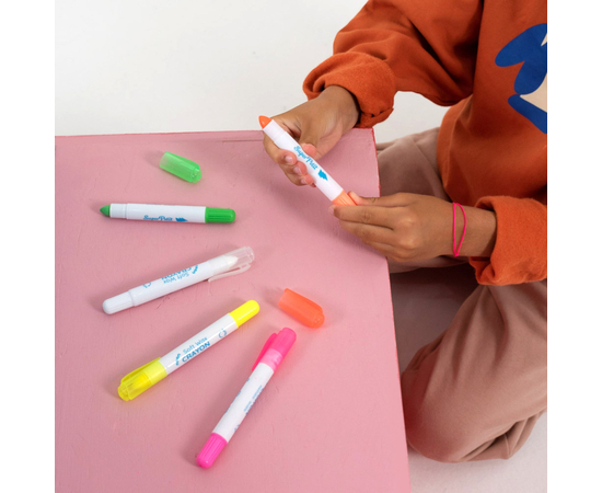 Αυτές οι εξαιρετικά απαλές κηρομπογιές δημιουργούν επίσης εντυπωσιακό εφέ ακουαρέλας στο χαρτί! Το σετ περιλαμβάνει 5 κηρομπογιές διπλής όψης που καθαρίζονται εύκολα, ιδανικές για δημιουργικό παιχνίδι παντού — σε παράθυρα, καθρέφτες, ή ακόμη και στην μπανιέρα!