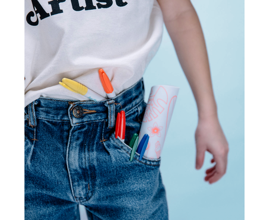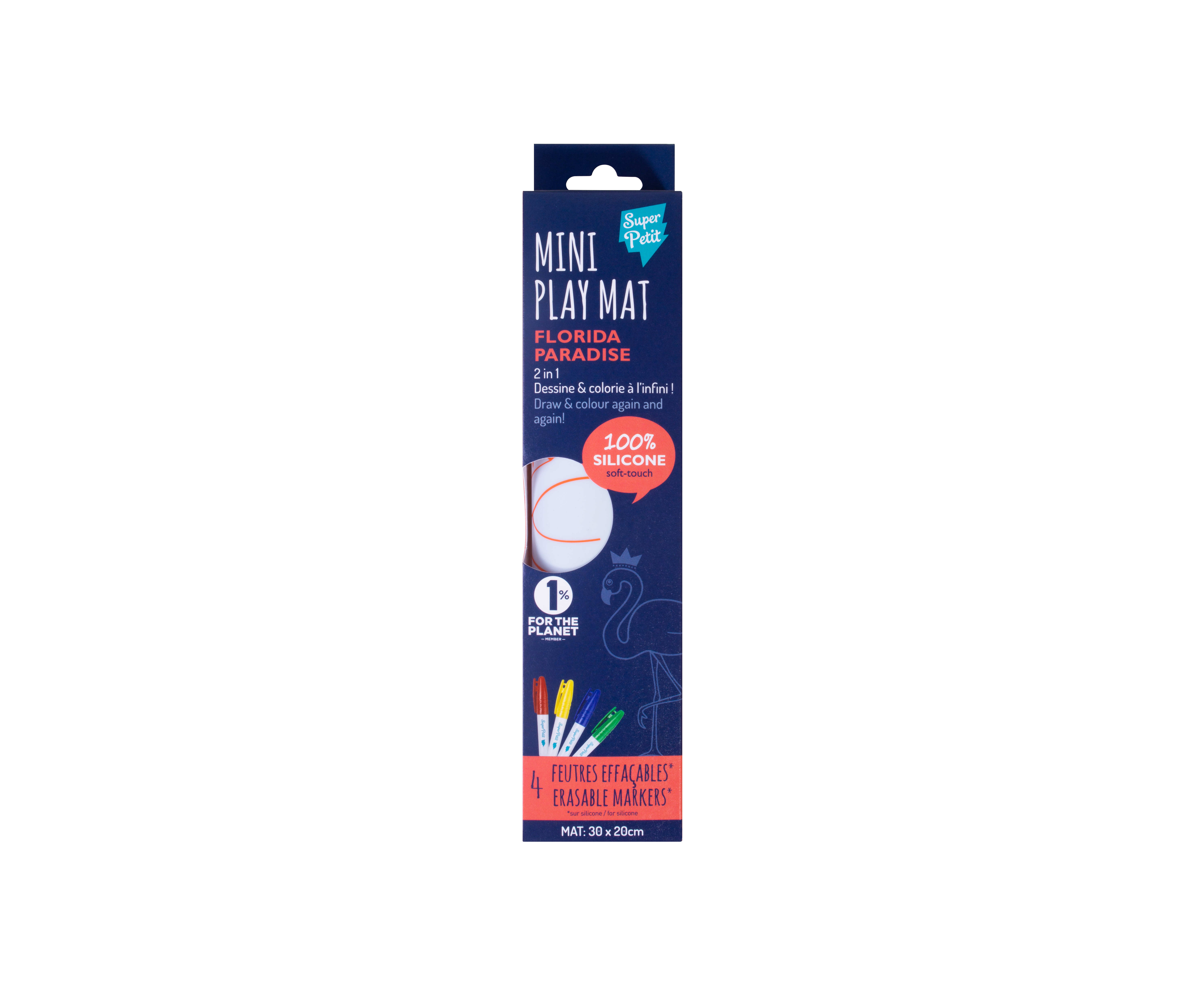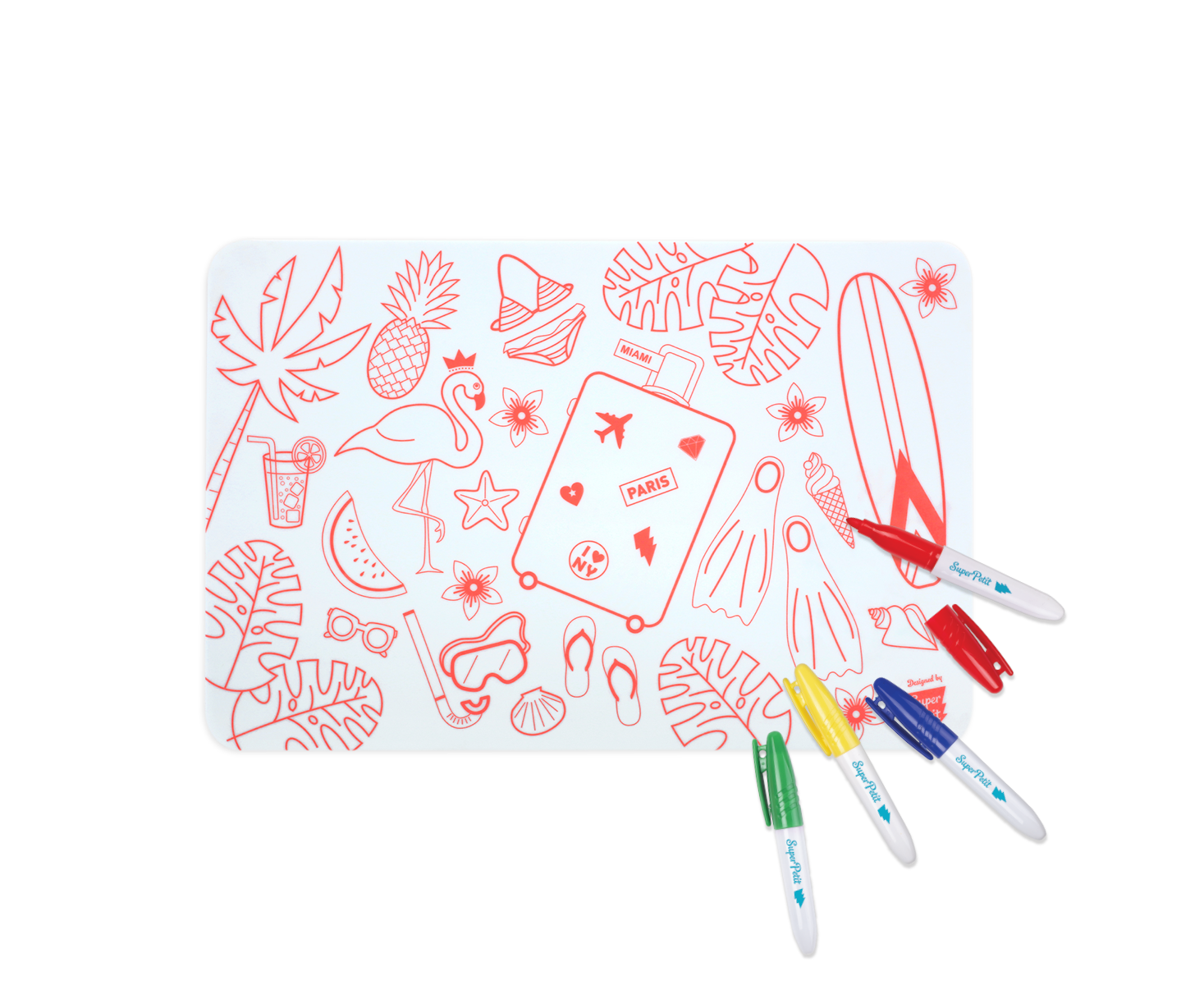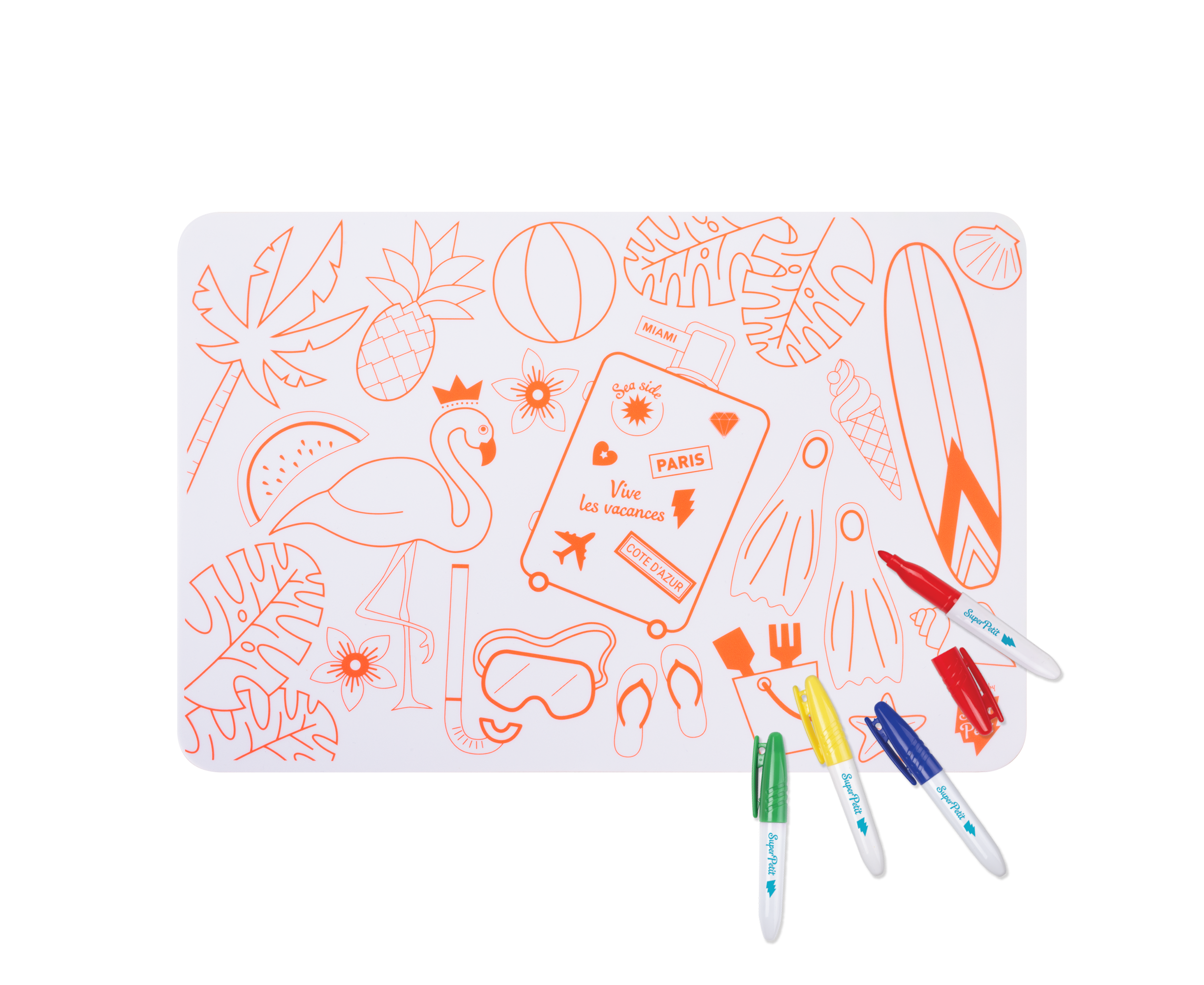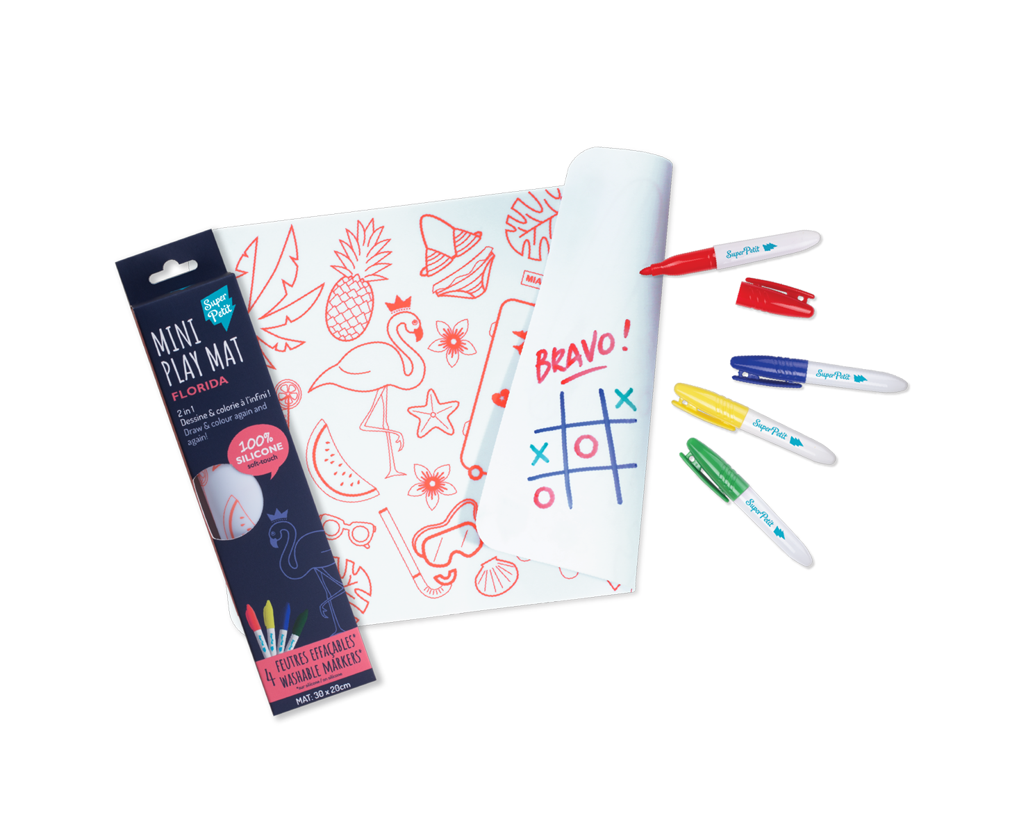 Το μινι σουπλά διπλής όψεως της Super Petit είναι προτυπωμένο με παιχνιδιάρικα σχέδια και περιλαμβάνει 4 ειδικούς μαρκαδόρους που καθαρίζονται με νερό.