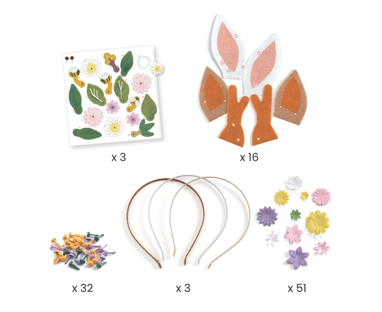 Το απόλυτο σετ χειροτεχνίας για μικρούς δημιουργούς, από την εταιρεία Djeco. Φτιάξτε τρεις πανέμορφες στέκες για τα μαλλιά και διακοσμήστε τες με αυτάκια, λουλούδια και κομψές floral λεπτομέρειες. Τα αυτάκια είναι κατασκευασμένα από εύκαμπτο, αυτοκόλλητο τσόχινο υλικό, που εφαρμόζει εύκολα. Οι στέκες είναι άνετες στη χρήση και προσθέτουν μια διασκεδαστική boho πινελιά που δεν χάνει ποτέ τη γοητεία της! Η δραστηριότητα είναι ιδανική για να την απολαύσουν πολλά παιδιά μαζί, ενώ οι αναλυτικές οδηγίες καθοδηγούν βήμα-βήμα τη δημιουργία, εξασφαλίζοντας ένα όμορφο και μοναδικό αποτέλεσμα. Το σετ περιλαμβάνει τρία ζευγάρια τσόχινων, αυτοκόλλητων αυτιών, τρεις στέκες, 50 ανάγλυφα χάρτινα λουλούδια σε διάφορα σχέδια και χρώματα, τέσσερα φύλλα με προ-κομμένες floral διακοσμήσεις, 32 πολύχρωμα μεταλλικά στηρίγματα και ένα αναλυτικό εγχειρίδιο οδηγιών. Κατάλληλο από 6 ετών και άνω.