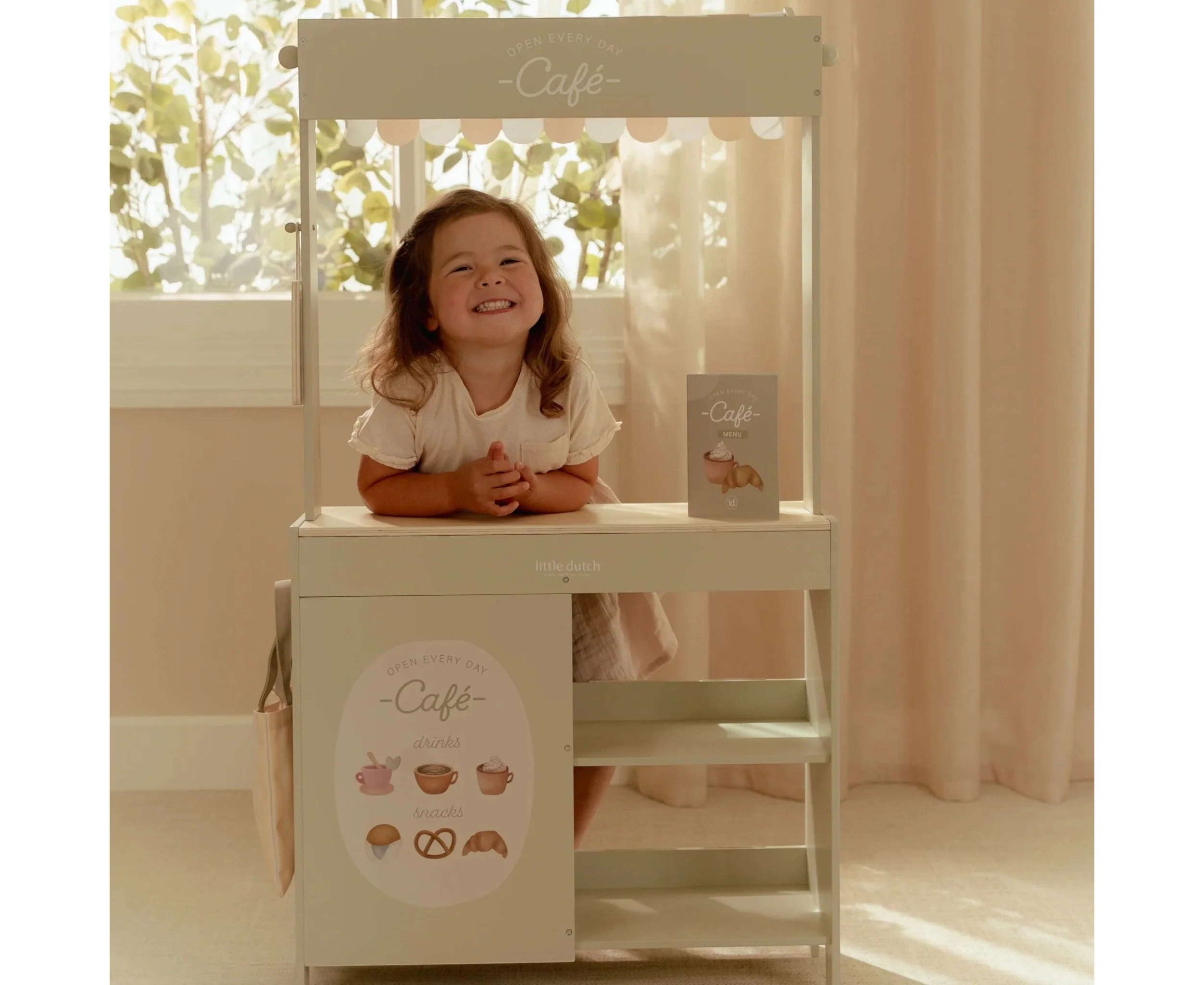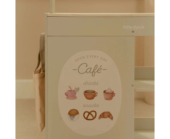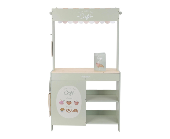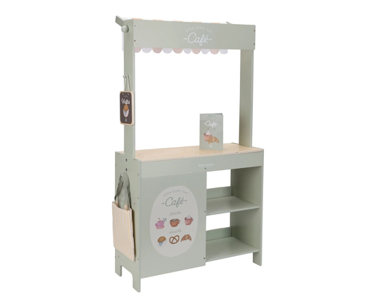 Κι εδώ είναι η έκπληξη, αν γυρίσετε τον πάγκο, μετατρέπεται σε ένα ζεστό καφέ, με μενού και χαρούμενες εικονογραφήσεις. Συνδυάστε το με ταμειακή μηχανή, ζυγαριά ή πιατέλα γλυκών για ατελείωτο παιχνίδι ρόλων.