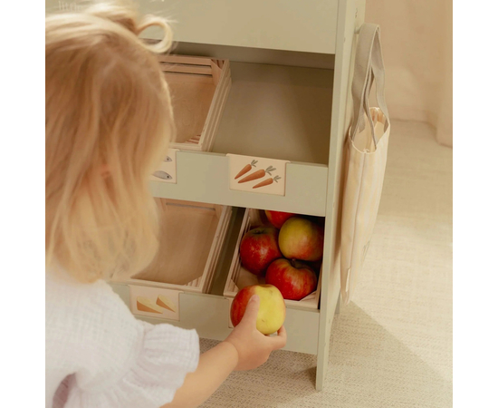 Αυτός ο υπέροχος ξύλινος πάγκος επιτρέπει στα παιδιά να δημιουργήσουν το δικό τους μαγαζάκι. Η υφασμάτινη τέντα δίνει αυθεντική ατμόσφαιρα αγοράς, ενώ ο πίνακας κιμωλίας και οι εικονογραφημένες καρτέλες βοηθούν στην όμορφη παρουσίαση των προϊόντων. Το σετ περιλαμβάνει επίσης καφάσια και τσάντα αγορών για μια ρεαλιστική εμπειρία.