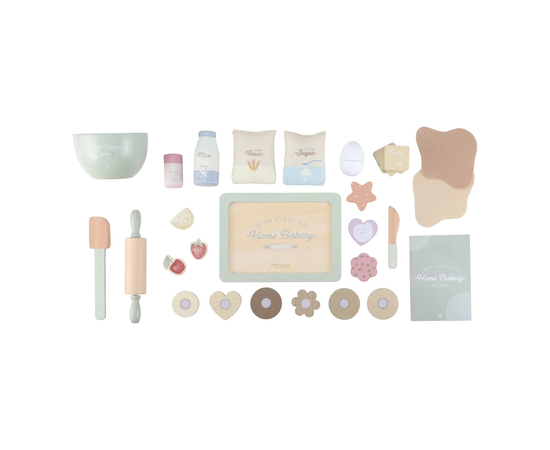 Το σετ περιλαμβάνει κάρτα με συνταγές, μπολ ανάμειξης, δίσκο με μπισκότα και όλα τα «υλικά» όπως βούτυρο, αυγά, αλεύρι, ζάχαρη, γάλα και πολύχρωμα ζαχαρωτά.
