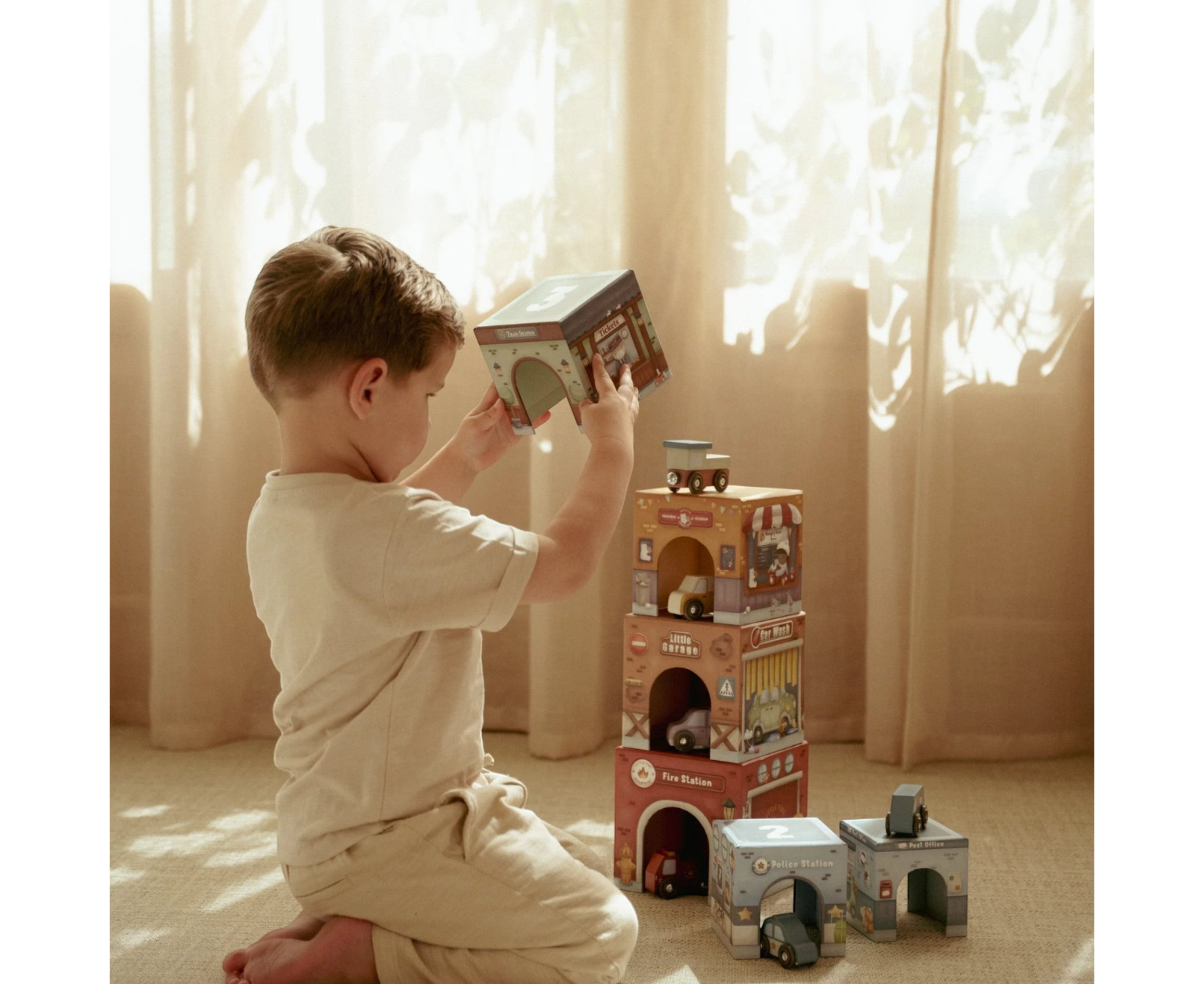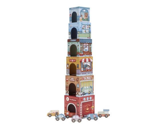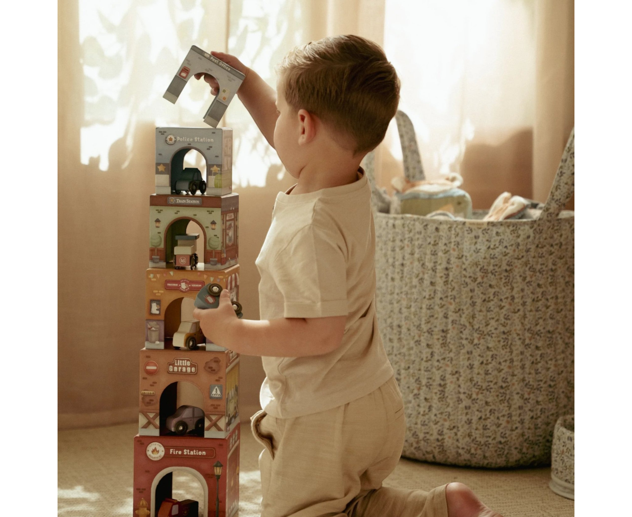 - Περιλαμβάνει 6 κύβους από ανθεκτικό χαρτόνι με πιστοποίηση FSC και ξύλινα αυτοκινητάκια.