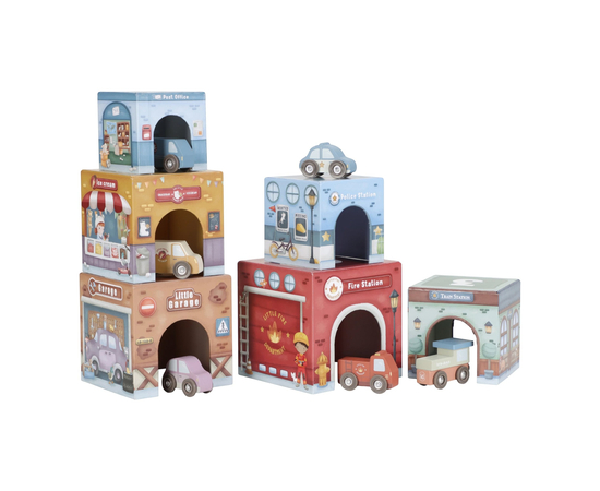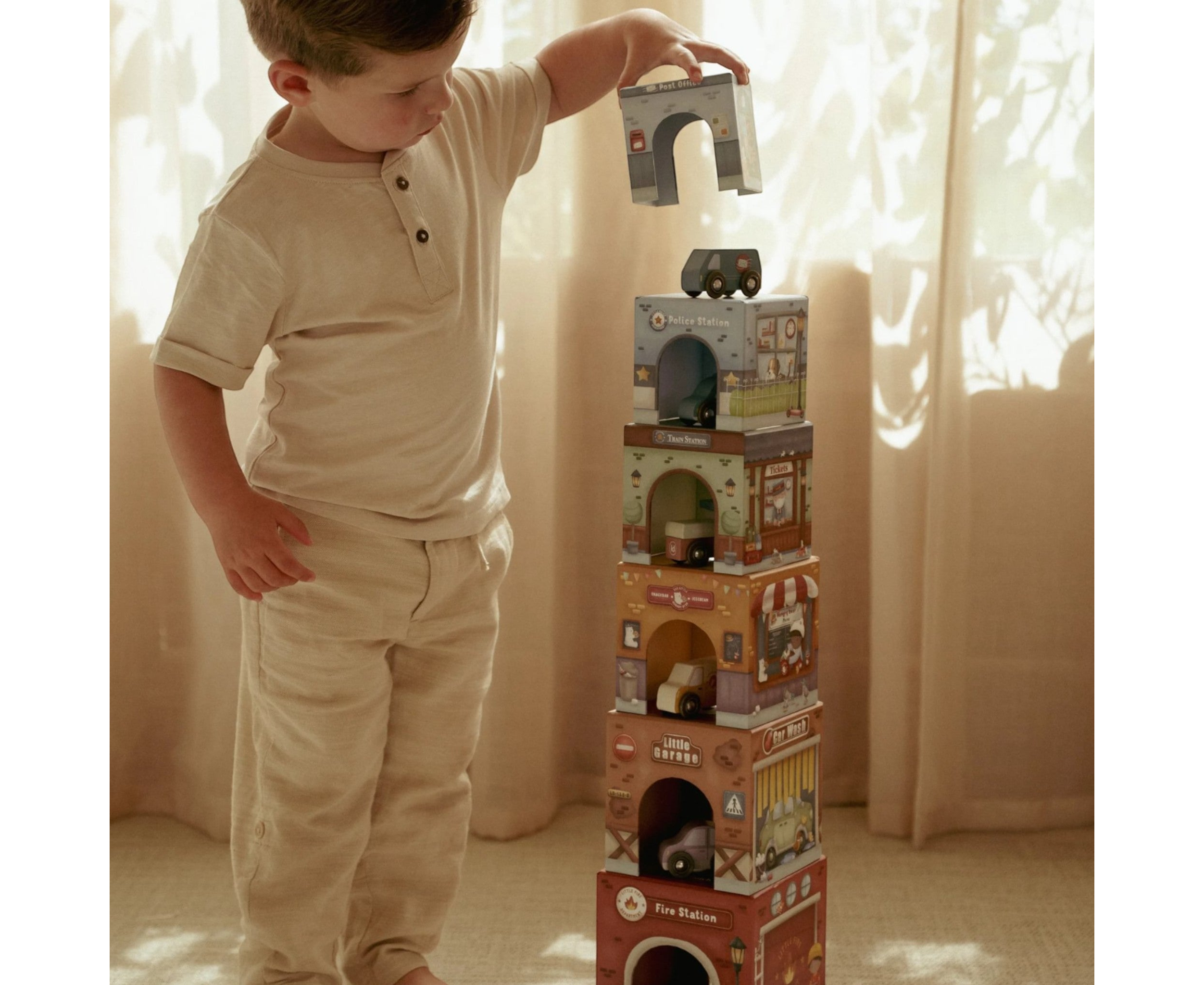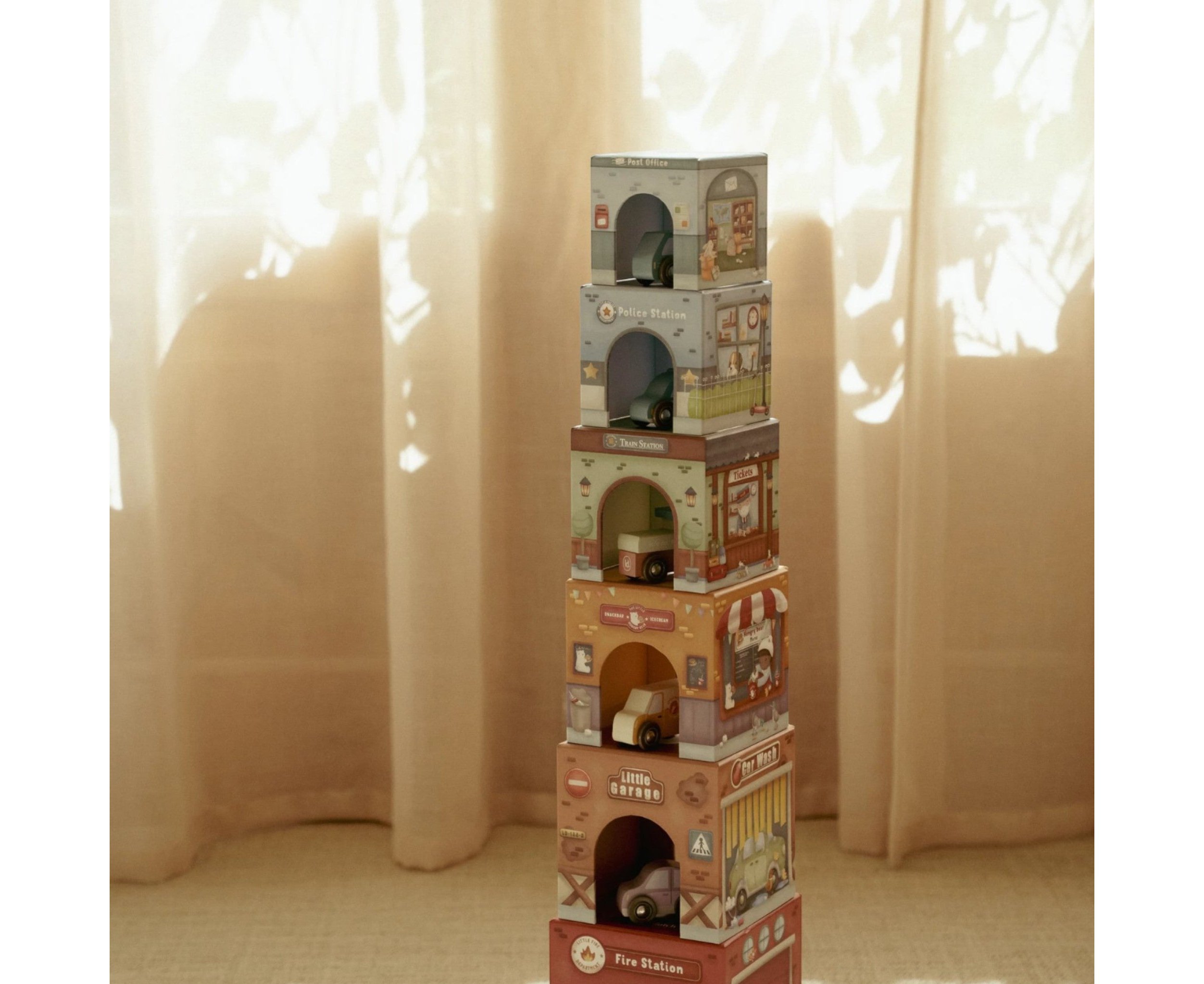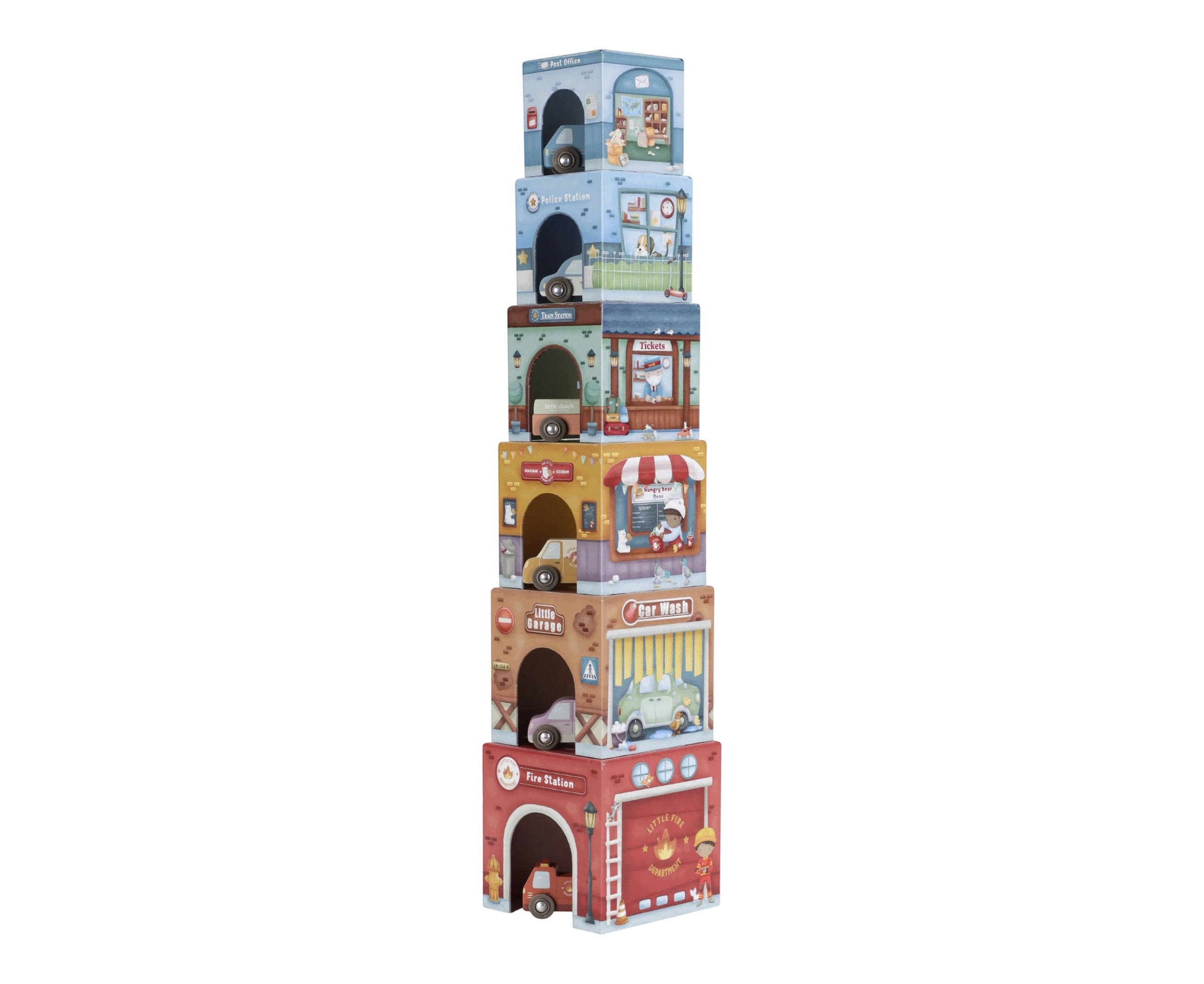 - Περιλαμβάνει 6 κύβους από ανθεκτικό χαρτόνι με πιστοποίηση FSC και ξύλινα αυτοκινητάκια.