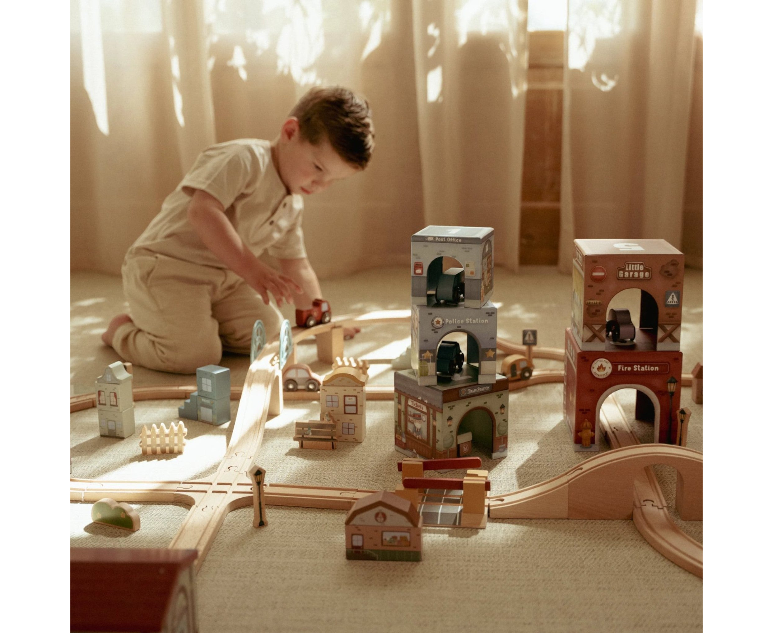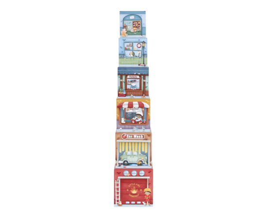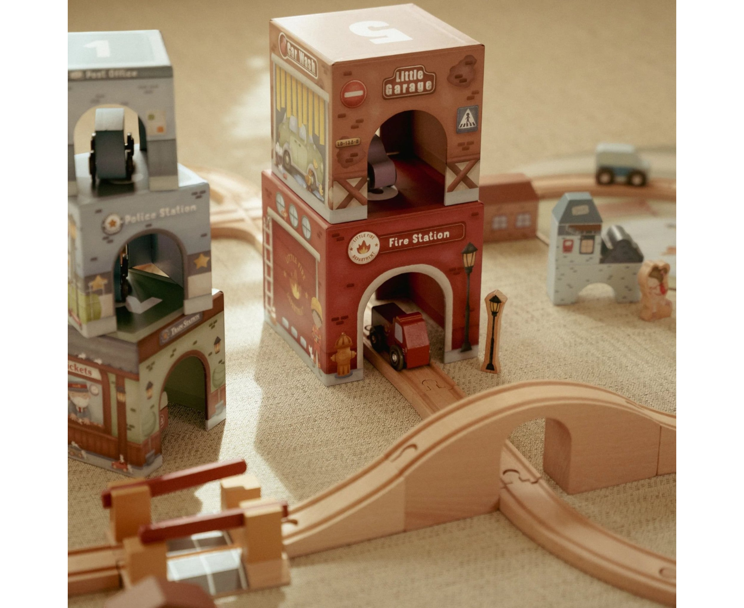 Αυτό το χαρούμενο σετ περιλαμβάνει 6 εικονογραφημένους χάρτινους κύβους και αντίστοιχα οχήματα, προσφέροντας αμέτρητες δυνατότητες παιχνιδιού και φαντασίας. Οι κύβοι μπορούν να στοιβαχτούν ο ένας πάνω στον άλλο ή να τοποθετηθούν πάνω στις ράγες του τρένου, επιτρέποντας στα οχήματα να περνούν από κάτω με ευκολία.