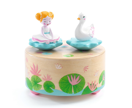Ξύλινο μουσικό κουτί της εταιρείας Djeco, εμπνευσμένο από την λίμνη των κύκνων. Κάθε φορά που θα το κουρδίζετε, θα παρατηρήσετε μια μπαλαρίνα και έναν κύκνο να στροβιλίζονται και να χορεύουν, χάρη στον ειδικό μαγνητικό μηχανισμό που διαθέτουν! Σχεδιάζεται στη Γαλλία και είναι κατασκευασμένο από μασίφ ξύλο καουτσουκόδεντρου. Είναι απόλυτα ασφαλές για τις μικρές ηλικίες, γιατί δε περιλαμβάνει μικρά κομμάτια και είναι βαμμένο με μη τοξικά βερνίκια που έχουν βάση το νερό. Δεν απαιτεί μπαταρίες, γιατί διαθέτει κουρδιζόμενο μηχανισμό, που παίζει τη μελωδία “Swan lake” με μέγιστη διάρκεια τα 2:30 λεπτά. Ιδανική πρόταση για τη διακόσμηση του παιδικού δωματίου που εγγυάται γαλήνιες και ήρεμες νύχτες.