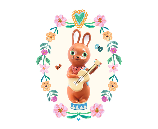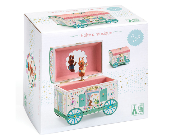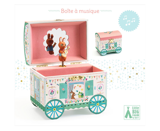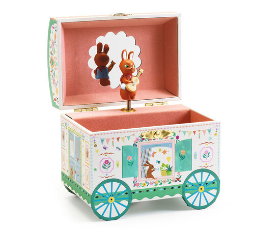 Ξύλινο μουσικό κουτί - μπιζουτιέρα από την εταιρεία Djeco με υπέροχα μοτίβα και χρώματα. Κουρδίστε το κουτί, ανοίξτε το καπάκι και παρακολουθήστε τον κούνελο να στριφογυρίζει στη μελωδία “Le temps des cerises ”! Ένα ιδιαίτερο αξεσουάρ διακόσμησης, αλλά και αποθήκευσης κοσμημάτων, μυστικών και μικρών θησαυρών. Διαθέτει χώρο αποθήκευσης με γαλάζια βελούδινη επένδυση και έναν καθρέφτη σε σχήμα λουλουδιού.