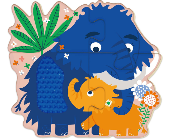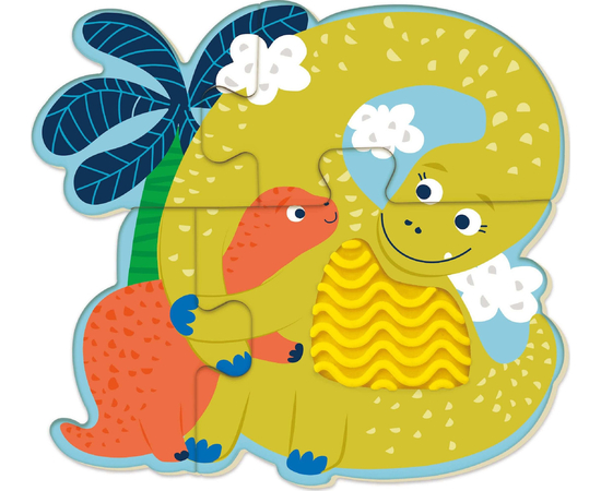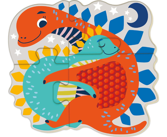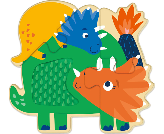 Κάθε κομμάτι του παζλ απεικονίζει πολύχρωμους δεινόσαυρους με διαφορετικές υφές αφής (touch textures), βοηθώντας τα παιδιά να αναγνωρίσουν σχήματα, χρώματα και υλικά μέσα από το παιχνίδι.