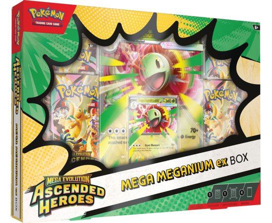 Το Pokémon TCG: Mega Evolution—Ascended Heroes Mega Meganium ex Box, Mega Emboar ex Box ή Mega Feraligatr ex Box περιλαμβάνει: