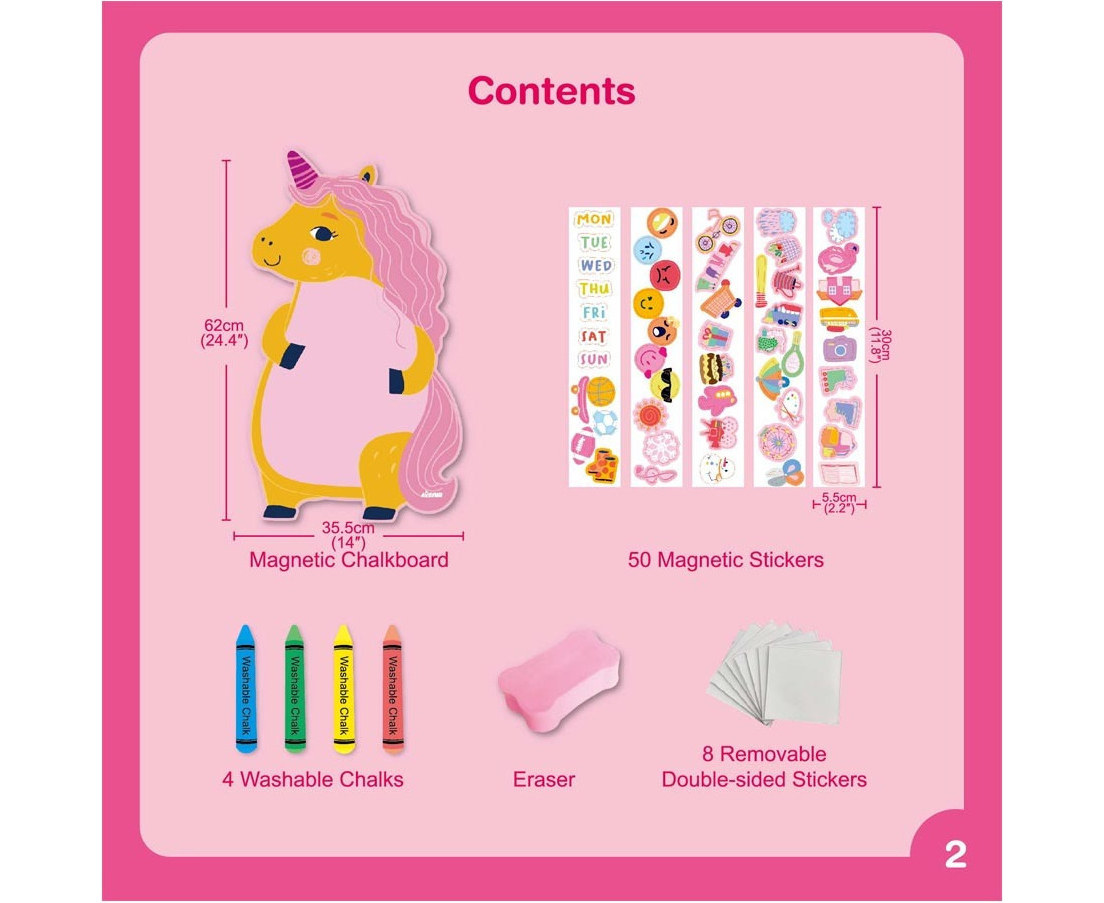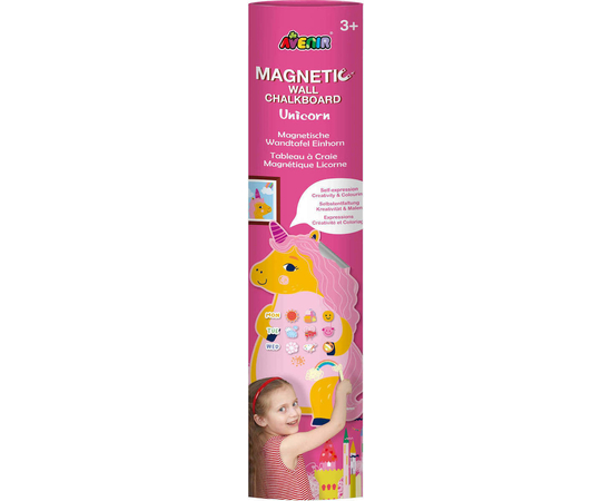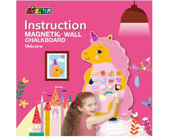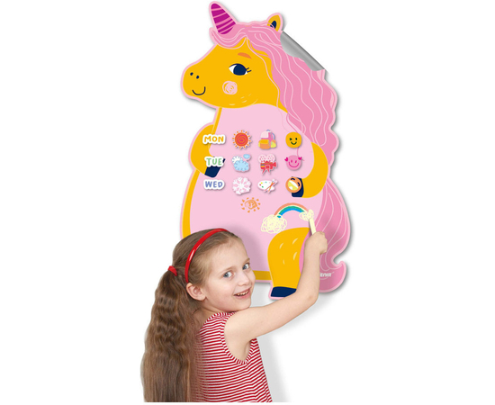 Τα παιδιά μπορούν να ζωγραφίσουν με κιμωλίες, να παίξουν με μαγνητικά κομμάτια και να δημιουργήσουν τις δικές τους ιστορίες πάνω στον πίνακα με θέμα τον αγαπημένο μονόκερο.